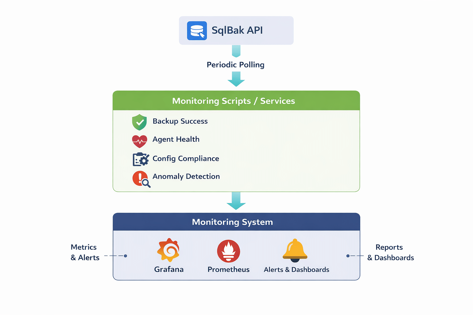These scripts periodically query the SqlBak API and transform backup data into metrics, alerts, or reports that fit into the company’s standard monitoring pipeline.