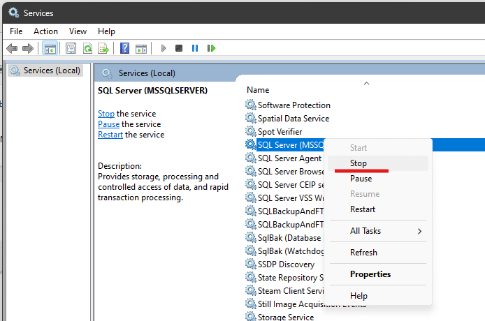 - Now you can reopen the list of Windows services and start SQL Server again: